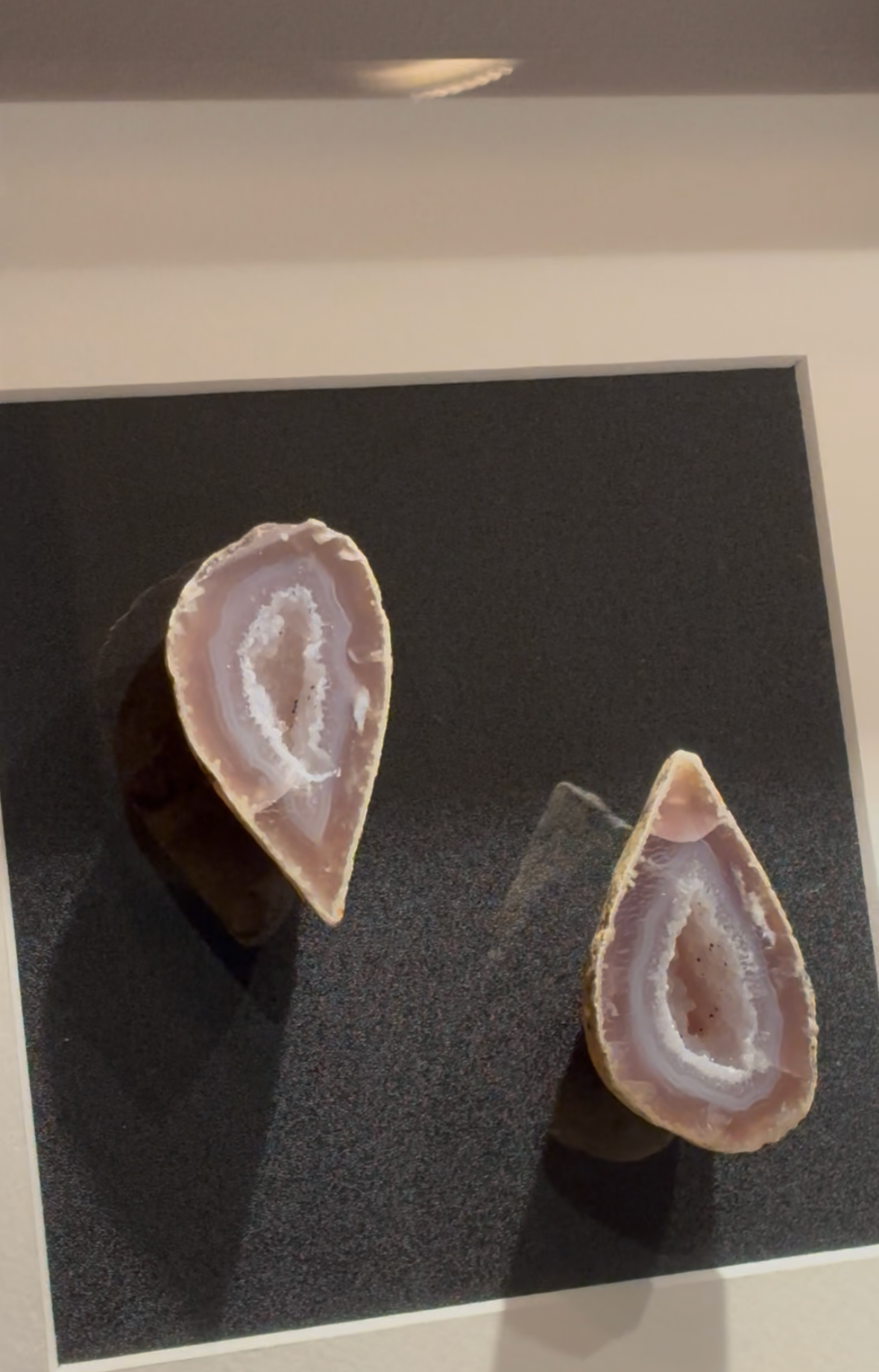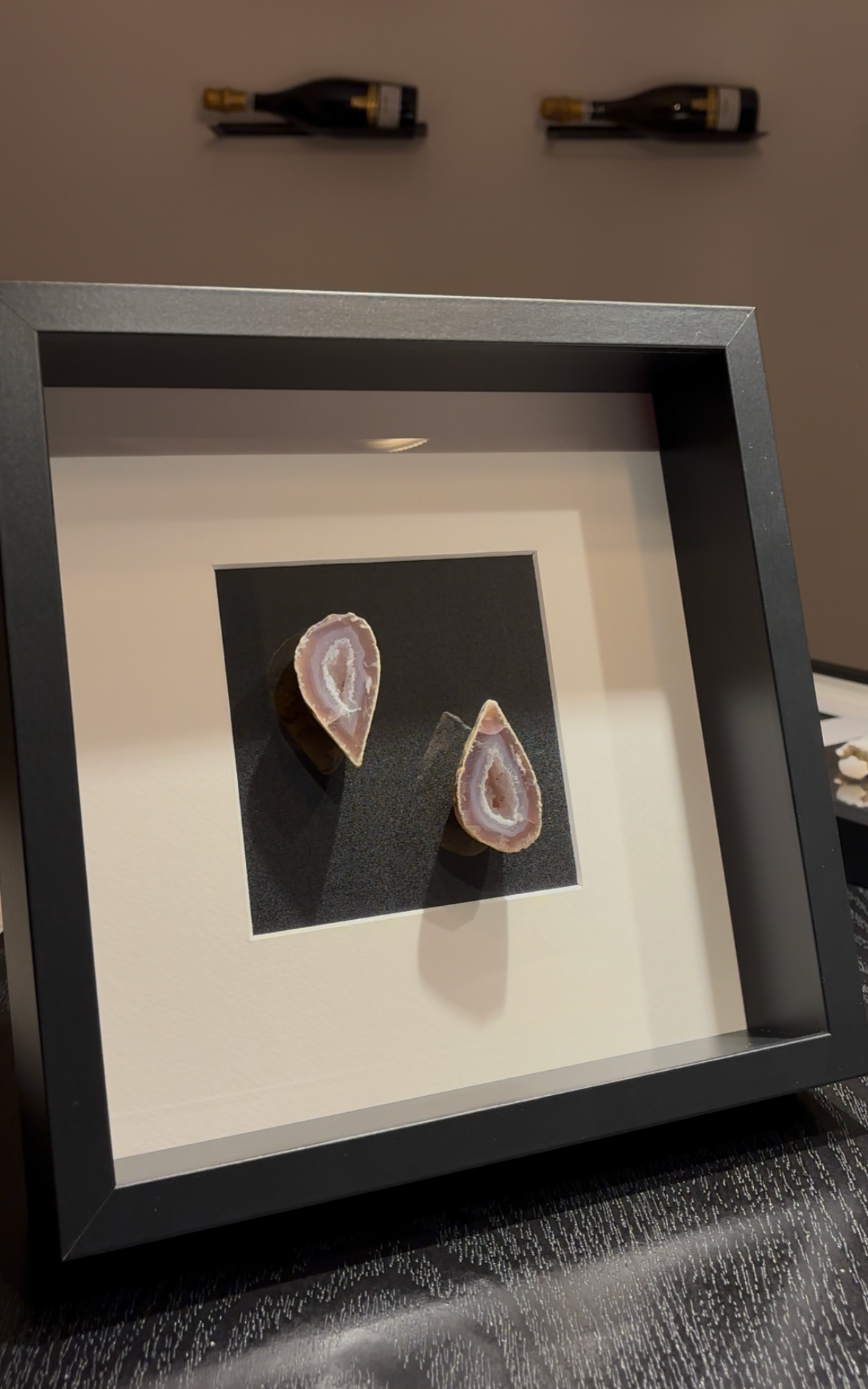 Een gesplitste natuurlijke agaat, gevormd in de diepte van de aarde, gevangen in een minimalistische zwarte lijst.